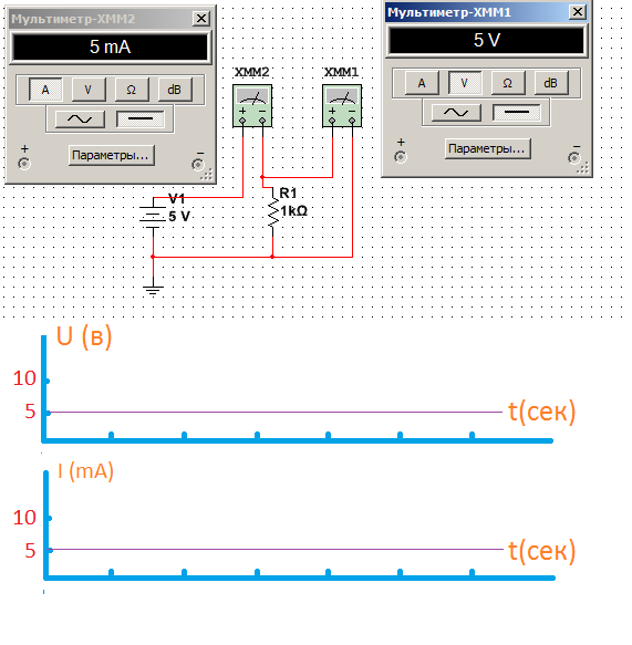 Так устроен человеческий мозг, что большой объем информации он воспринимает визуально. Поэтому большое значение для представления происходящих процессов используют графики. Вспомним или узнаем что такое графической представление. Электроника использует такие параметры как: напряжение, ток, частота, фаза (к этому подойдем позднее). Как правило все процессы наблюдаются относительно времени, то есть одна из шкал - это время. Хотя отлично помним, что есть ВАХ (вольт-амперная характеристика) у электронных компонентов. Как видно из схемы мы подключили, сопротивление к источнику питания и подключили вольтметр и амперметр. Теперь смотрим, что они будут показывать во времени. Тут всё просто - это же постоянные цепи, соответственно при постоянном напряжении и ток постоянный. А теперь рассмотрим RC цепь, и в момент запуска через определенные промежутки будет снимать показания. Время одна секунда, ток 2,23 мА, если вспомним при данных параметрах, но без ёмкости, ток был 5 мА. Прошло 2 секунд