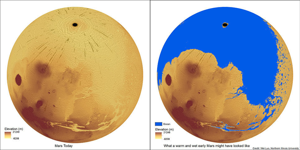 РИА Новости https://ria.ru/space/20180320/1516806077.html Исследователи считают, что океан на Марсе образовался несколько миллиардов лет назад. Образование воды на красной планете они свзывают с формированием вулканического нагорья Тарсис. Извержение вулканов сопровождалось выбросом газов, что поспособствовало изменению атмосферы. Это и поспособствовало образованию воды. Береговая линия океана формировалась примерно в одно время с самим нагорьем Тарсис. Наблюдатели с Земли выяснили, что за почти 4 миллиарда лет с поверхности Марса исчезло огромное количество воды. Ученые строят