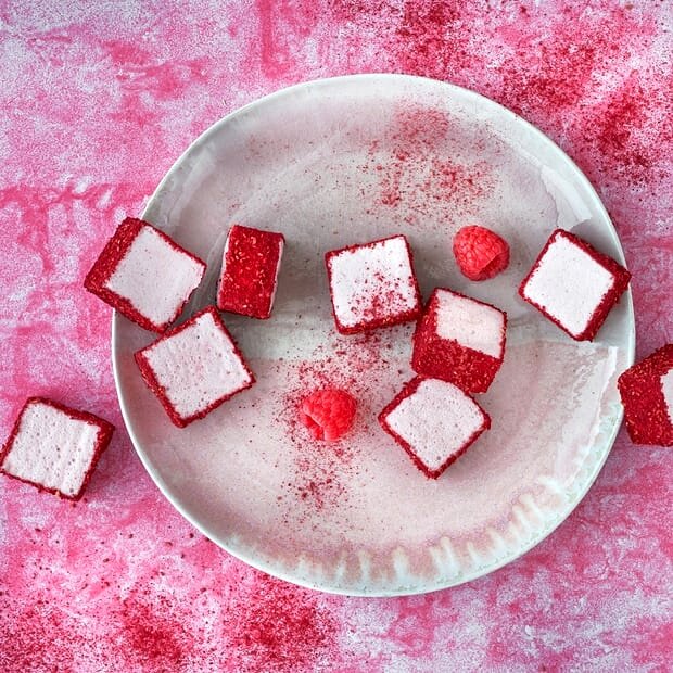 сахарная пудра - 25 г. кукурузная мука - 25 г. яичный белок - 1 шт. малина - 175 г. лимонный сахар - 200г. холодная вода - 180 г. желатин - 2 шт. (30 г.) экстракт ванильный - 1 ч.л. высушенная малина - 35 г. Смажьте поддон для выпечки (20х30 см.) небольшим количеством масла, положите бумагу для запекания и тоже смажьте ее. Смешайте пудру с кукурузной мукой и просейте на поддон. Малину с сахаром нагревайте в кастрюле до тех пор, пока смесь не начнет пузыриться (примерно 10 мин.). Процедите смесь от семян малины. На дно чистой кастрюли налейте 60 г. воды и добавьте оставшийся песок. Нагревайте до растворения сахара, но не перемешивайте (подсказка ниже). В оставшейся воде растворите желатин и медленно нагревайте с постоянным помешиванием до полного растворения желатина. Снимите с огня и добавьте малиновое пюре и ванильный экстракт. Эту смесь добавьте к сахарному сиропу (выключенный огонь) и взбейте. В миксере с венчиком взбейте белок до средних жестких пиков, сразу добавьте смесь из си