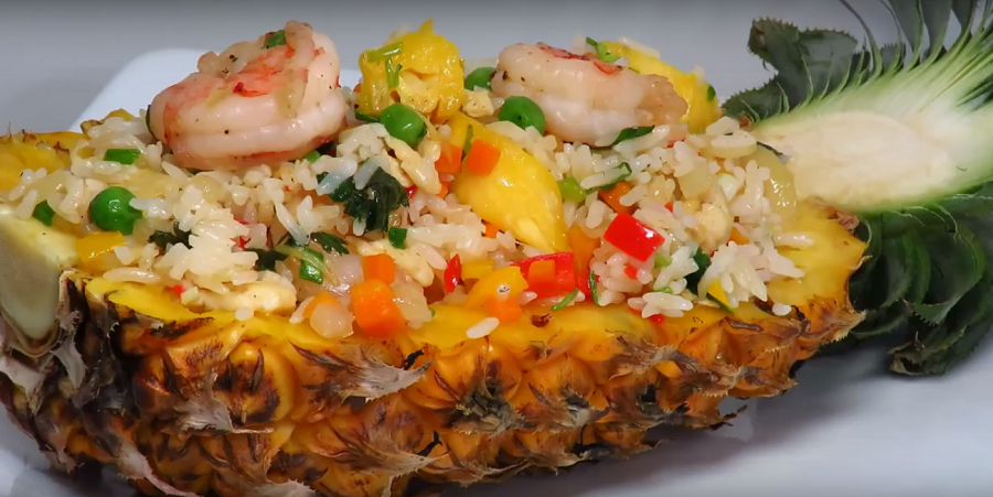 - Готовый гарнир перекладываем в подготовленные «тарелки» из ананаса и подаем к столу.