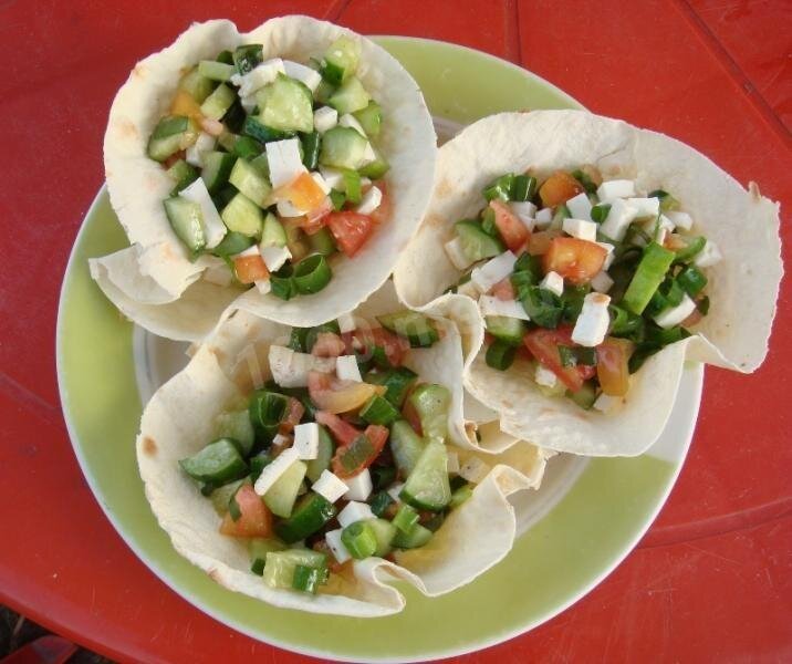 Представляем вам рецепт удивительной закуски. Корзиночки из лаваша готовятся очень быстро и просто. В результате получается вкусная и хрустящая закуска, которая понравится всем, без исключения. Салат для корзинок можно использовать любой. К примеру, салат «Вкусняшка», рецепт его приготовления есть на сайте. Необходимые продукты Начинаем приготовление