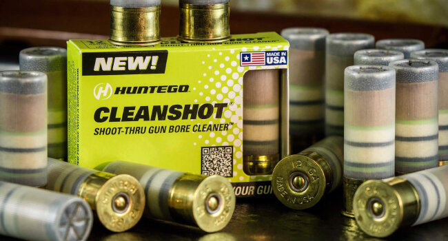 Компания Huntergo на оружейной выставке SHOT Show 2018 показала патроны Cleanshot, предназначенные для быстрой чистки ствола посредством простого выстрела. Многосоставной чистящий элемент под большим давлением проходит внутренний канал гладкого ствола, убирая при этом различные частицы, нагар и загрязнения и оставляя за собой только зеркально отполированную поверхность. Согласно официальному описанию, эффективность данного способа находится на уровне обычной качественной чистки, благодаря плотно проходимому под высоким давлением патчу, которое невозможно развить вручную шомполом. Многосоставная cборка патрона состоит из: волокнистого контейнера, который стирает сильный нагар; небольшой навески дроби, развивающей определенное давление; высокоплотного чистящего двухсекционного элемента из комбинированных материалов цилиндрической формы, установленного на фирменный пыж в центре; двухрядного пыжа из специального материала, работающего как газовое уплотнение, увеличивающее рабочее давление