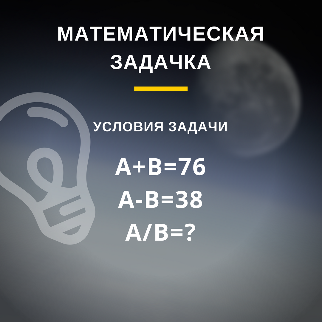Попробуйте решить эту задачку и посчитать, чему равно частное "A" и "B". Небольшая подсказка: Чтобы решить данную задачку, необходимо выразить "A"через "B", и "B" через "A". Я думаю, что с этим задание без проблем справятся все, кто хоть немного понимал математику в школе! Ответ ждет под стрелкой. Рассмотрим условия задачи. 1) А+В=76 2) А-В=38 Выразим "В" через "А" из второго выражения и получим: В=А-38 (при переносе меняем знаки на противоположные) Далее подставим значение "В" в первое выражение: А+(А-38)=76 А+А-38=76 2А=76+38 2А=114 А=57 Теперь, зная "А", выразим "В" из первого выражения: В=76-А В=76-57 В=19 Осталось лишь посчитать частное А/В: 57/19=3 Ответ: 3. Если у тебя получился такой же ответ, ставь палец вверх!