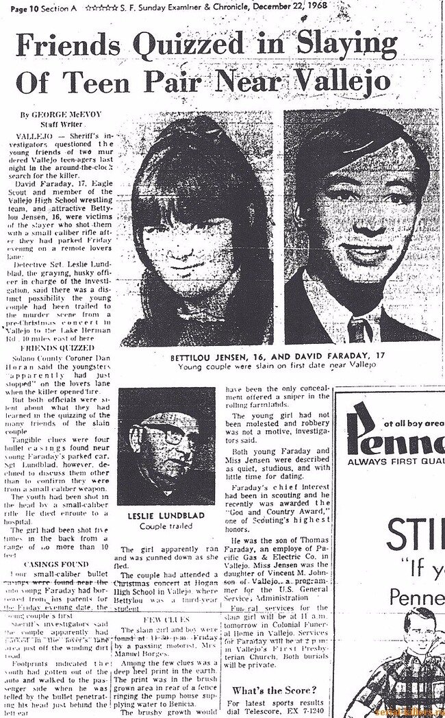17-летний Дэвид Артур Фарадей и 16-летняя Бетти Лу Дженсен застрелены 20 декабря 1968 года на шоссе, проходящем в городской черте калифорнийского города Бениша.