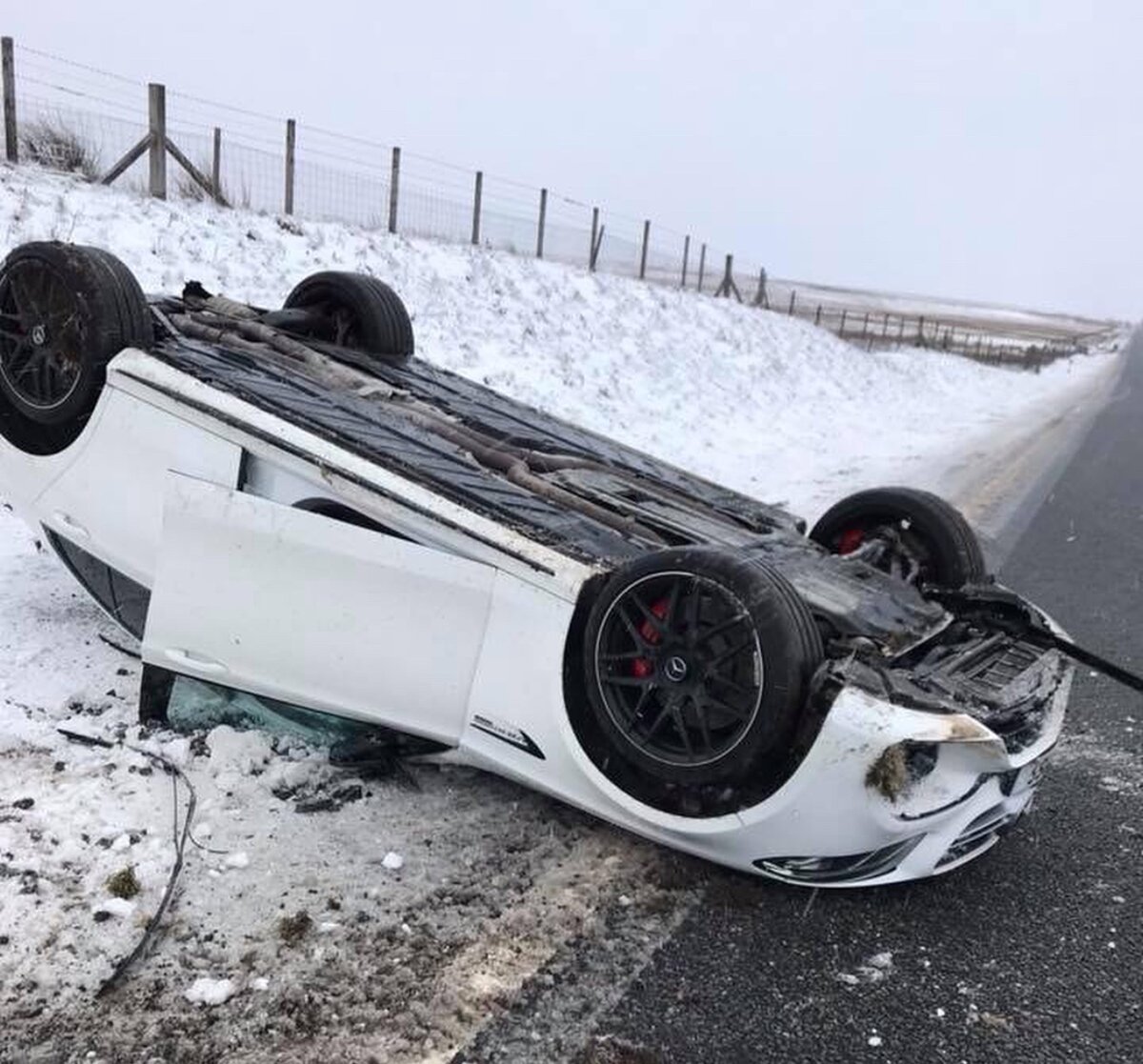 Когда на "Мерседесе" сзади, по бокам и на решетке радиатора вы видите шильдики с надписями AMG, это чаще всего значит, что перед вами очень мощный и быстрый автомобиль. Седан Mercedes-AMG E63 S как раз из их числа. Он разгоняется до 100 км/ч за 3,4 сек и при отключении электронного ограничителя способен набрать скорость более 300 км/ч. Под капотом у него располагается 4-литровый V8 мощностью 612 л.с. Именно такой впечатляющий седан на днях разбили предположительно в Великобритании. Подробностей происшествия практически нет, однако известно, что автомобиль совершил 3 переворота вокруг своей продольной оси. Не понятно, какая была скорость, но, очевидно, немаленькая. Машину безумно жалко, но, главное, что никто не пострадал. Фотографиями поделился инстаграм-блогер @jsyamg, проживающий на острове Джерси (Нормандские острова). В ДТП же попал его друг из Соединенного Королевства, у которого, вероятно, вся жизнь перед глазами пролетела. При том, что повреждения у авто внушительные, видно, чт