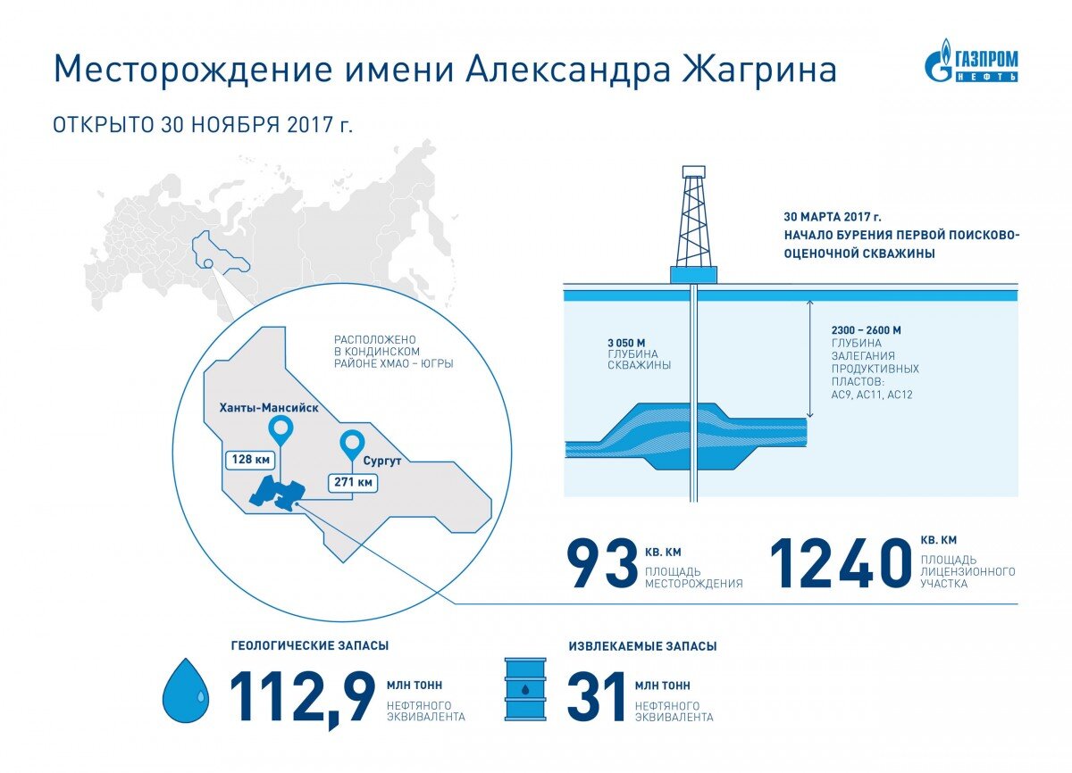 По результатам проведенной государственной экспертизы Федеральным агентством по недропользованию извлекаемые запасы месторождения «Газпром нефти» имени Александра Жагрина в Ханты-Мансийском автономном округе увеличены до 31 млн тонн нефтяного эквивалента. Об этом «Газпром нефть» сообщила 20 марта 2018 года. Таким образом комиссия подтвердила сделанный экспертами геологический прогноз по площади нефтеносности участка, уточнив ранее сделанный предварительный расчет. Согласно действующей классификации нефтяных участков, месторождение имени Александра Жагрина отнесено к категории крупных. Месторождение было открыто в конце 2017 года на перспективном лицензионном участке в Кондинском районе Ханты-Мансийского автономного округа. В январе 2018 года новому активу «Газпром нефти» присвоено имя Александра Жагрина — бывшего главы дирекции по добыче компании. Геологоразведочные работы на лицензионном участке в Кондинском районе Ханты-Мансийского автономного округа ведет «Газпромнефть-Хантос», доч