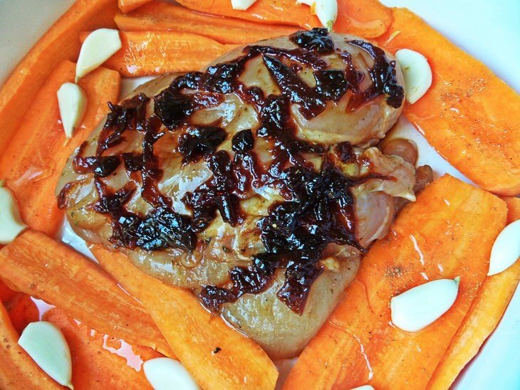 Ингредиенты: ✅Филе куриное — 350 г ✅Конфитюр луковый — 2 ст. л. ✅ Соевый соус — 3 ст. л. ✅ Приправы для курицы — 1 ч. л. ✅ Гарнир: Морковь — 0,5 кг ✅ Чеснок — по вкусу ✅ Кориандр ✅Соль ✅Перец ✅Оливковое масло 📌Приготовление: 1. Грудку обливаем соевым соусом и обсыпаем приправами. Даем немного помариноваться в соусе. 2. Пока чистим морковку, чеснок (советую чеснока побольше!). 3. В керамическую форму выкладываем ломтики моркови, сверху чеснок, посыпаем специями, поливаем маслом. В центре выкладываем филе, намазав его конфитюром для пикантности! 4. Конфитюр готовый — подарок с юга, пахнет бальзамиком и имеет лёгкую сладость. Его можно приготовить самим или просто посыпать курочку кольцами лука. 5. Ставим запекаться форму с курицей и овощами на полчаса. Надо учитывать,что керамическая форма минут 5 будет только нагреваться, зато потом долго держит тепло и в ней можно подавать на стол!