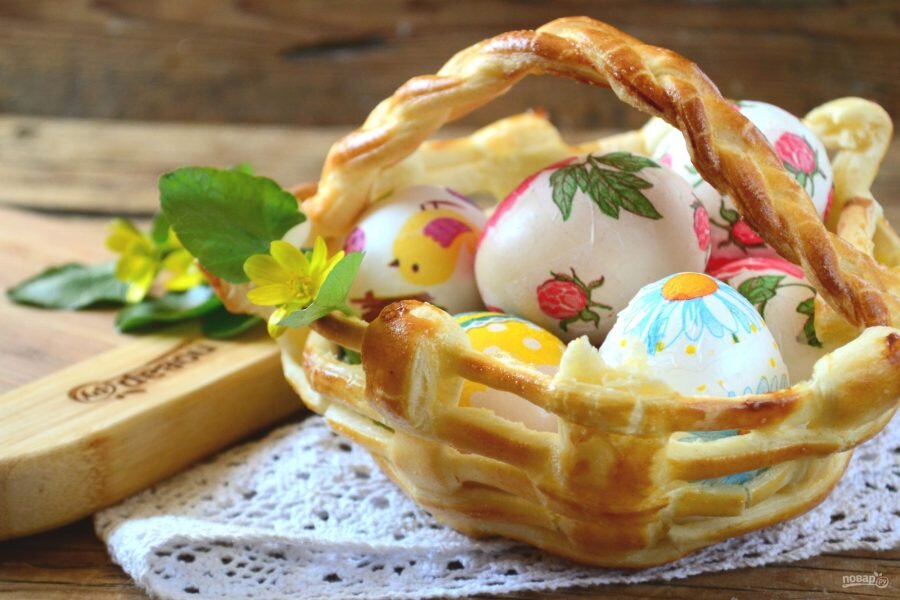 Сделать корзинку для пасхальных яиц невероятно просто. Нам понадобится готовое слоеное тесто и фольга. Обратите внимание, что корзинки из слоеного теста получаются менее прочными, нежели корзинки из сдобного теста. Поэтому советую делать несколько маленьким корзинок, если у вас много пасхальных яиц. 1. Подготовьте форму. Возьмите небольшой глиняный горшочек. Убедитесь, что он не треснет в духовке. Горшочек оберните фольгой, чтобы легче было снять готовую корзинку. 2. Тесто раскатайте примерно до 3-4 мм. Порежьте его на 3 полоски шириной 10-12 мм, а остальное тесто порежьте на полоски 5-6 мм. Широкие полоски выложите, как снежинку, чтобы края спускались вниз. Лишние кусочки отрежьте. С одной стороны слегка раздвиньте полоски и сделайте еще одну, чтобы в результате получилось непарное количество полосок, иначе плести корзинку не получится. Там, где дно, тесто слегка приплюсните, чтобы готовая корзинка стояла. Начинайте плести корзинку от дна, используя тонкие полоски. 3. Переложите кор