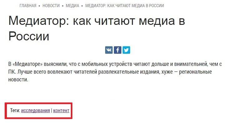 Прочитав материал, пользователь увидит метки: исследования, контент. Кликнув на одну из них, он получит доступ ко всем материалам по теме. Тег «исследования» приведет его к другим исследованиям, «контент» — к публикациям про контент.