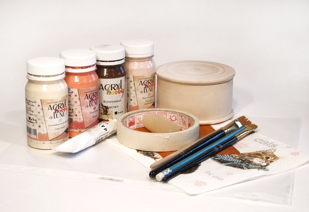 1. заготовка из дерева или собственная основа для декупажа (коробка, дощечка, баночка и т.п.);