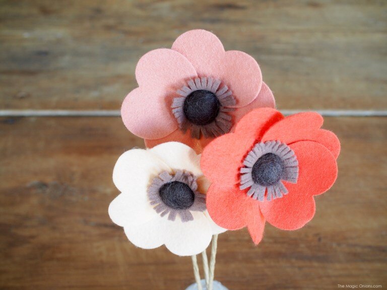 Сегодня мы сделаем небольшие, но очень симпатичные цветы из фетра. Материалы для работы: - клеевой термопистолет, - цветочный провод или длинная деревянная шпажка, - лист красного фетра, - лист коричневого фетра, - ножницы, - шарик из коричневой шерсти или фетра. Шаг 1. Вырежьте сердце из бумаги, около 5-6 см в диаметре. Прикрепите его к фетру и используйте в качестве трафарета. Вырежьте 4 таких сердца из фетра красного цвета. Шаг 2. Расположите сердца по кругу, слегка накладывая друг на друга, чтобы они выглядели как лепестки цветка. Используйте горячий клей, чтобы соединить их в местах перекрытия. Шаг 3. Отрежьте полоску фетра коричневого цвета, примерно 7-8 см в длину и 1,5 см в ширину. Делаем бахрому. Используйте острые ножницы, чтобы сделать поперёк небольшие разрезы. Разрезы должны останавливаться примерно на половине ширины полоски. Шаг 4. Измерьте окружность шерстяного шарика из фетра и приклейте нужную длину получившейся бахромы на горячий клей стык в стык. Это будет середи