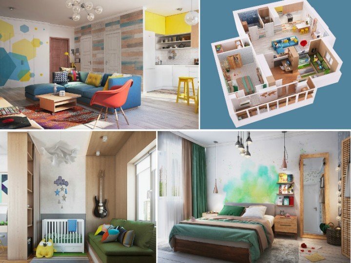 В статье расскажем об организации интерьера дома площадью 80 квадратных метров. Принципы работы, примененные здесь, в равной степени подходят для разработки дизайна домов большей или меньшей площади. Итак, как создать дизайн дома 80 кв. м? Ответим на этот вопрос на примере готового дизайн-проекта. Гостиная плюс кухня Архитекторы использовали в этом интерьере разные цвета и материалы. Так они разделили помещение на функциональные зоны. Задняя стенка гостиной оклеена обоями под крашеное дерево. Так, с помощью цвета и фактуры, удалось отмежевать зону кухни. Большой синий диван, стоящий не у стены - центральное место этого интерьера. Пол дощатый. Для объединения пространства в общую композицию используются аксессуары желтого цвета: диванные подушки, табуреты, светильники. Дизайн спальни Плавающие полки экономят пространство. На них аккуратно расставлены красивые книги об искусстве. Смотрится оригинально. Акварельная роспись в изголовье кровати сначала смущает, но смотрится воздушно. С обе