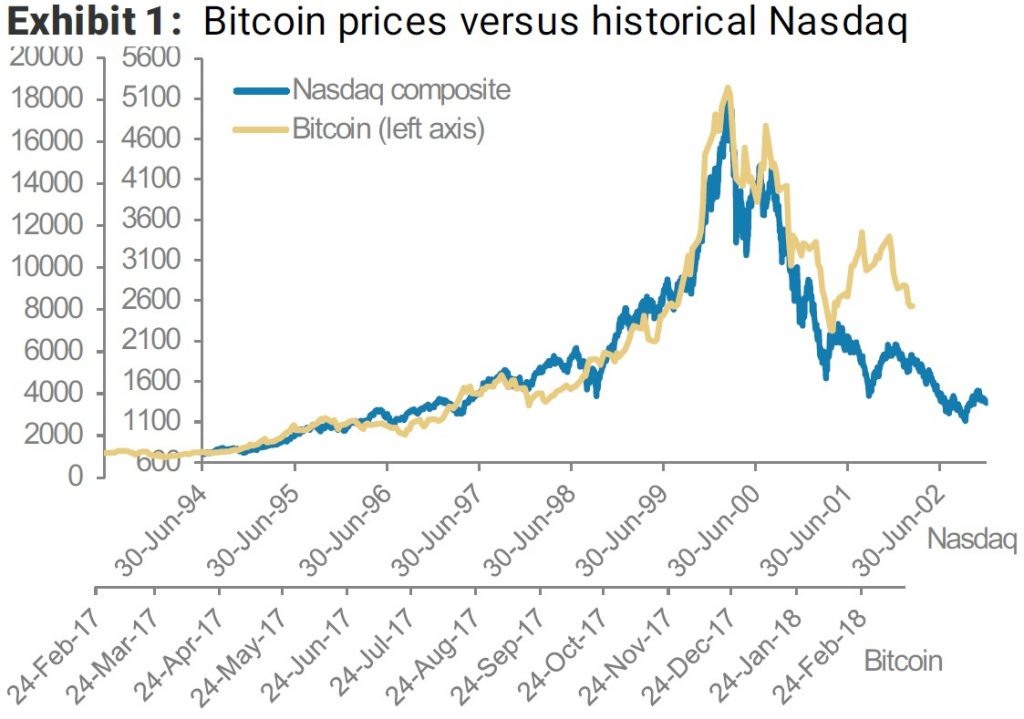 Группа аналитиков американского банковского холдинга Morgan Stanley опубликовала новый отчет, в котором проводятся параллели между недавним взлетом биткоина и бумом «доткомов», произошедшим в конце 90-х годов, сообщает Bloomberg. По словам аналитиков, в настоящее время движение курса биткоина практически полностью повторяет Nasdaq Composite Index в преддверии и после 2000 года, но в 15 раз быстрее. Тогда индекс вырос на 278% за 519 дней и достиг максимума в марте 2000-го. В свою очередь биткоин подскочил на 248% всего за 35 дней — вплоть до рекордной отметки в $19 511 в прошлом декабре, говорится в отчете. Кроме того, отмечается, что с конца прошлого года биткоин пережил три волны падений, когда его цена каждый раз опускалась на 45–50%, прежде чем происходил отскок. В то же время Nasdaq после 2000 года испытал пять резких падений, которые в среднем составляли аналогичные 44%. Медвежий рынок не является чем-то новым для первой децентрализованной цифровой валюты. Так, после рекордов конц