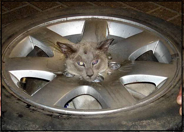 Знакомьтесь, этого синеглазого кота зовут Сиам, он по жизни любит две вещи, кушать мясо и гулять в гараже частного дома. Эта забавная история началась с того, что хозяйка питомца сменив летнюю резину на зимнюю, оставила старые покрышки с дисками лежащими просто на полу гаража. Кот Сиам же не мог унять свое любопытство и залез внутрь диска колеса, но когда захотел выбираться, то просто застрял головой в нем. Целый час он пытался самостоятельно выбраться, но когда не получилось все таки решил громко мяукать и звать свою хозяйку, которая и увидела его уже в таком виде. Хозяйка любопытной кошки вначале старалась сама его вытащить, даже использовала жидкое мыло, что бы затолкать его голову назад, но все было тщетно. Коту в это время уже очень надоело сидеть и он просто начинал протяжно мяукать, тогда хозяйка не дожидаясь своего мужа и вызвала спасателей. Приехавшие спасатели, посмеялись над ситуацией, но тоже не смогли ничего сделать, был придуман план, распилить диск колеса, что бы выта
