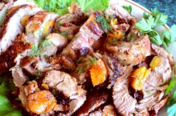 Удивительно вкусное блюдо. Процесс приготовления довольно прост и не занимает много времени, а вкусовые качества приятно порадуют. Это блюдо займет ведущее место в вашем рационе. ИНГРЕДИЕНТЫ; Свиная вырезка -500 гр. Курага -200 гр. Чернослив без косточек -300 гр. Лук - 2 луковици Сыр твердый -150 гр. Салат листовой - качан Майонез -300 мл. Маслины без косточек- 1 баночка Зелень укропа, петрушки по несколько веточек. Лимон -1 шт. Соль, перец молотый по вкусу. Фольга. Включаем духовку для прогрева на 200 градусов. Готовим. Мясо промыть, нарезать на порционные кусочки - 2 см., Слегка отбить с двух сторон, посолить, поперчить. Чернослив промыть, в не большой мисочке залить кипятком и отставить в сторонке. Лук нарезать кольцами. Сыр натереть на крупной терке. Подготовить противень, из фольги