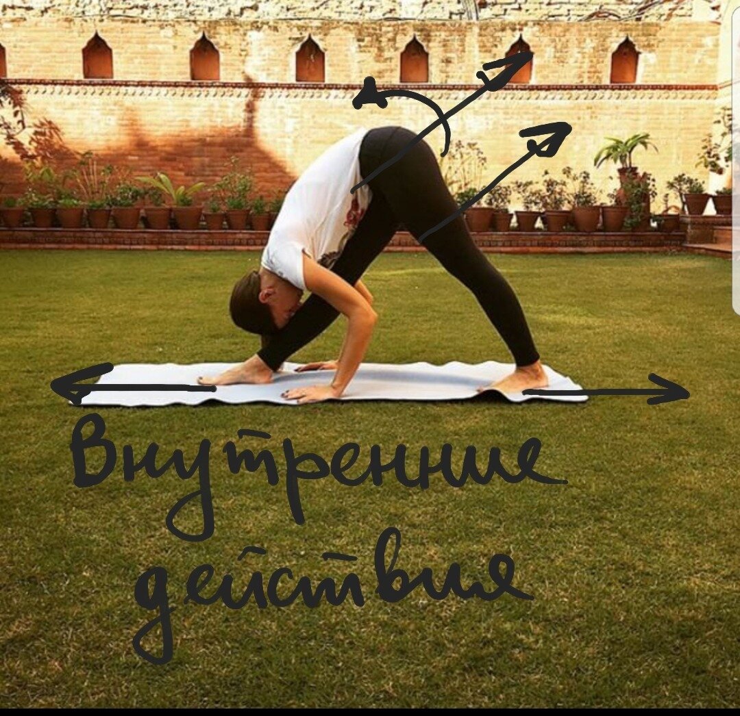 Паршваттонасана или наклон стоя к одной ноге. Это одна из базовых поз стоя, что не значит, что она простая. Я бы сказала даже, что она довольно сложная и на то, чтоб в ней чувстовать себя спокойно требуются месяцы, а то и годы практики. Проблема начинающих обычно такая: Вес падает на переднюю ногу, которая сильно согнута. Задняя стопа не полностью стоит на полу. Пятка оторвана. Спина скругляется. Плечи зажаты. Сильно тянет заднюю поверхность передней ноги и также подколенные и голеностопные связки в задней ноге. Я напишу что же нужно делать, чтобы исправить эту ситуацию. Только вот, увы, просто знать не достаточно... в этом сложность позы. Долгое время, даже уже поняв все внутренние действия, тут мало что можно улучшить. Поэтому: 1. Настройтесь на работу внимания и визуализацию. Не ждите быстрого прогресса. 2. Переднюю стопу вжимайте в пол. Её переднюю часть особенно. Ею толкайте коврик вниз и вперёд. 3. Держите переднюю ногу согнутой, но не падайте на неё всем весом. 4. Чтоб не пада