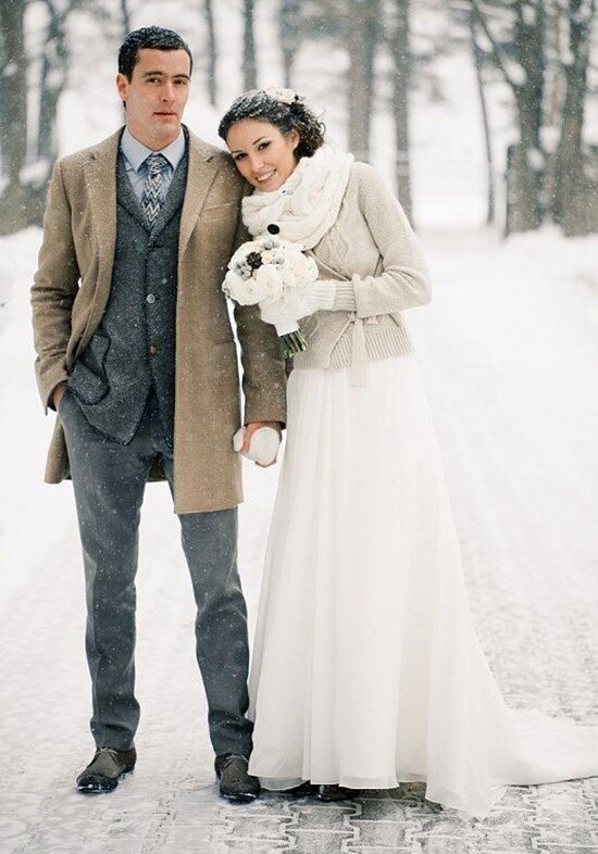 Зимний образ невесты нужно создавать исходя с точки зрения не только красоты, но и комфорта. Вряд ли синеющая на глазах новобрачная будет выглядеть счастливой, хотя и выберет самое стильное и модное платье. Только вот беда, не соответствующее погоде. Предлагаем вашему вниманию интересные идеи свадебного зимнего наряда. Свадебное платье для свадьбы зимой В 2018 году в тренде будут платья простого и лаконичного кроя, многоярусные модели еще можно выдержать летом, но пробираться по сугробам в наряде «а-ля Барби» – удовольствие сомнительное. В коллекциях многих современных дизайнеров присутствуют платья с длинным рукавом – они сейчас на пике моды. Шея может быть закрыта изящным воротничком или съемной накидкой. Кстати, если вы хотите отойти от стереотипов, смело выбирайте вязаное платье. Платье не обязательно должно быть белым – оно попросту сливается со снегом. В моде пепельный, светло-розовый, марсала, персиковый, мятные оттенки – такой наряд будет выглядеть свежо и ориги