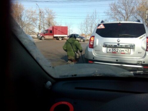 На перекрестке Мелькомбинатовского проезда и улицы Московской с наступлением тепла по утрам можно наблюдать печальную картину. Инвалид без ног в зеленом ватнике и ушанке собирает милостыню у автомобилистов прямо под колесами автомобилей. Для паперти мужчина избрал разделительную полосу на перекрестке. Напомним, что такое явление в Кирове не редкость. В прошлом году ту же картину можно было наблюдать чуть ниже по той же улицу - на перекрестке с бывшей «Кирпичкой».