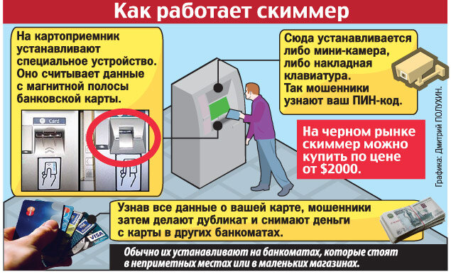 - Снимайте наличные только в офисах банков. Там установить скиммеры невозможно, потому что всюду стоят камеры.