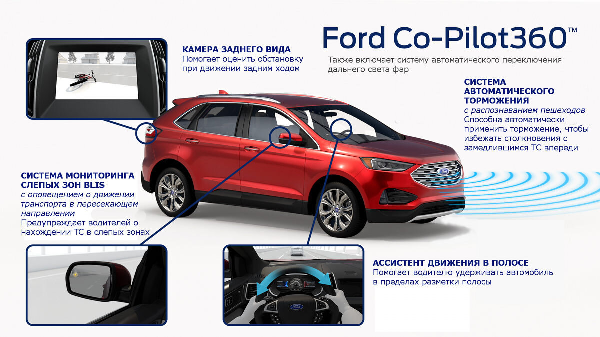 В Ford Co-Pilot360 входят система автоматического торможения с распознаванием пешеходов, система контроля слепых зон, ассистент движения в полосе, камера заднего вида и система автоматического переключения дальнего света. Большинство этих технологий уже доступны российским клиентам Ford. Система автоматического торможения перед впередиидущим автомобилем Active City Stop предлагается для Fiesta, Focus, Mondeo и Kuga, система мониторинга «слепых» зон BLIS – для Focus, Mondeo, Kuga, Explorer, ассистент движения в полосе – для Kuga и Explorer, камерой заднего вида могут быть оснащены Focus, Mondeo, Kuga и штатно – Explorer, система автоматического переключения дальнего света доступна для Focus, Mondeo, Kuga и Explorer.