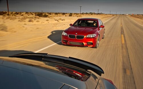 Как вы и предполагали, полностью обновленный BMW M5 — тоже не безобидная ромашка. Пятое поколение получило самый мощный двигатель за всю историю концерна. Предоставленные цифры — на грани разумного. V-образная «восьмерка» объемом 4,4 литра с двумя турбинами выдает невероятные 560 л.с. и 677 Нм крутящего момента, доступного уже при 1 500 оборотов в минуту и практически до самой отсечки. Впрочем, как это в последнее время бывает с форсированными моторами BMW, данные эти весьма занижены. Мощность в данном случае ближе к отметке 600 л.с., а пиковый крутящий момент граничит с отметкой 745 Нм. Одним словом, безумие. Результаты тестов первого F10 M5, попавшие к нам в руки, эти цифры полностью подтверждают. Этот немаленький и нелегкий заднеприводный седан разгоняется до 60 миль/час (96 км/час) за нереальные 3,7 секунды, а квотер пролетает за ошеломляющие 11,9 секунды, достигая на финише скорости 193,6 км/ч. Как любит говорить Пэрис Хилтон, это дофига. Хитрость же заключается в том, что мы говорим о европейской версии. А нам дали огненно-красную версию, предназначенную для североамериканского рынка. Она медленнее.