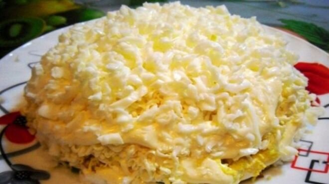 4.Тереть каждый слой продуктов нужно на весу над тарелкой ( или плоским блюдом), чтобы салат вышел действительно воздушным и нежным. Выкладываем салат «Невеста» слоями, делая между ними майонезную сетку.