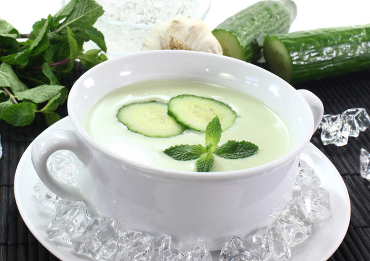 Холодные супы – это лёгкие полезные и вкусные блюда, которые прекрасно освежают организм. Для приготовления холодного огуречного супа нужны такие компоненты как: пачка кефира – 1 литр, огурец свежий парочка штук, лук зелёный – 125 грамм, зелень (петрушка и укроп) по 75 грамм, соль и перец чёрный по своему вкусу. Огурцы очистить от кожицы и измельчить в маленькие кубики. Остальную зелень накромсать и перемешать со специями. Соединить все компоненты в глубокой чаше. Можно влить в данное блюдо десертную ложечку растительного масла. Данный рецепт холодного супа очень прост и время его приготовления занимает меньше 7 минут.