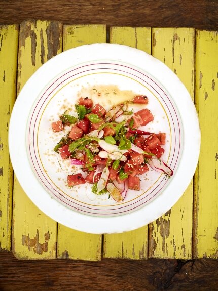Состав: 20 г семян кунжута ½ арбуза 1 пучок редиски 15г свежей мяты 1 лайм . ОСТРАЯ ЗАПРАВКА: ½ Зубчика чеснока 5 см кусок имбиря красный перец Чили (по вкусу) 1 столовая ложка соевого соуса 1 столовая ложка кунжутного масла Приготовление: Семена кунжута в течение нескольких минут прогреваем на среднем огне в сухой сковороде до появления ароматного запаха. Остужаем. Для заправки очищаем чеснок и имбирь, перец чили, затем измельчаем и складываем в стеклянную банку, в которую выжимаем сок лайма, смешиваем с соевым соусом и маслом. Плотно закрываем банку и хорошо встряхиваем полученную смесь. Очищаем от косточек мякоть арбуза и нарезаем на куски длиной 1 см., добавляем мелко нарезанный редис. Хорошо перемешиваем. Поливаем приготовленным соусом (из банки), посыпаем мелко нарезанной мятой и перемешиваем. Готовое блюдо сверху посыпаем поджаренными семенами кунжута. Приятного аппетита! Делайте ЗАКЛАДКИ, ПОДПИСЫВАЙТЕСЬ на мой канал, и мы сделаем нашу жизнь ВКУСНЕЕ!