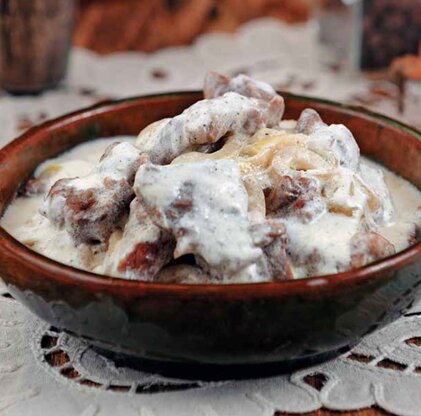 Время приготовления: 1 час 35 мин Ингредиенты: 1 кг мякоти говядины 5 ст. л. сливочного масла 5 средних луковиц 150 мл воды 2 ст. л. пшеничной муки 250 мл сметаны соль и перец по вкусу Приготовление: • Говядину промыть, обсушить. Нарезать на небольшие ломтики и отбить их деревянным молотком. • В сковороде разогреть половину сливочного масла, обжарить на нём ломтики мяса по 3–4 минуты с каждой стороны до румяной корочки. • Лук нарезать тонкими кольцами, спассеровать на оставшемся масле в отдельной сковороде 3–4 минуты. • Переложить мясо и лук в глубокую кастрюлю, влить в неё сок из сковороды, в которой жарилось мясо, добавить горячую воду. • Посолить, поперчить, закрыть крышкой и тушить на слабом огне около 1 часа до готовности мяса. • Муку развести сметаной, добавить в кастрюлю с мясом, довести до кипения, подержать 8–10 минут на слабом огне. Посолить и поперчить по вкусу. • Подавать блюдо горячим, в глубокой керамической посуде. Приятного аппетита!! Подписывайтесь на наш канал!!
