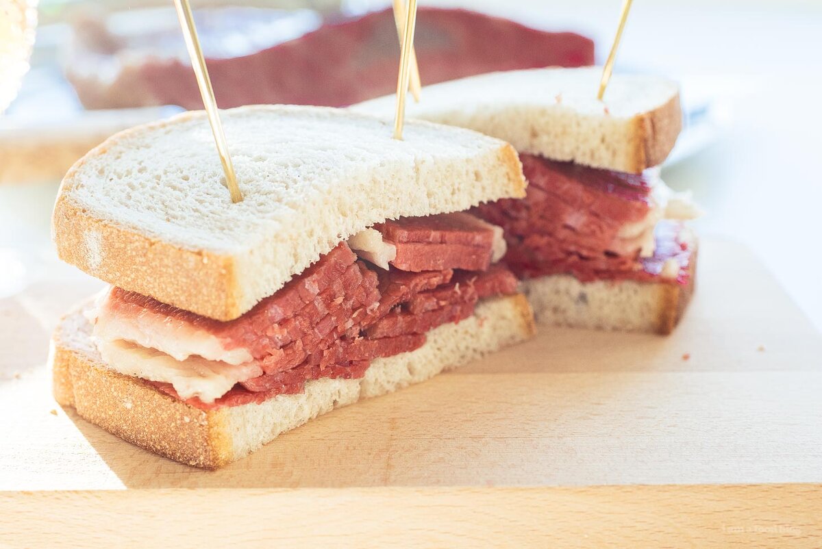 Ингридиенты: 1. 3/4 стакана кошерной соли 2. 1/2 стакана сахара 3. 2 чайные ложки розовой соли 4. 4 столовые ложки специй для маринования, разделенные пополам 5. 1 говяжья грудинка, 1200-4800 граммов 6. 4 литра воды Приступим! В контейнере достаточно большом, чтобы содержать грудинку плюс воду, добавьте воду, кошерную соль, сахар и розовую соль. Перемешайте до смешивания, затем добавьте 2 столовые ложки специй для маринования. Перемешать и добавить грудинку. Прижать грудинку тарелкой. Закрыть и хранить в холодильнике в течение 6 дней. Через 3 дня перевернуть грудинку, прижать тарелкой и убрать в холодильник. Спустя 6 дней достаньте грудинку и разогрейте духовку до 90 градусов. Подберите жароустойчивый горшок в который поместится ваша грудинка наполовину залитая водой. Поставьте тару залитую на половину водой на газ. Осторожно выньте грудинку из маринада и слегка промойте водой. Положить грудинку в горшок с 2-мя столовыми ложками специй для маринования и ждите, пока не закипит. Пе