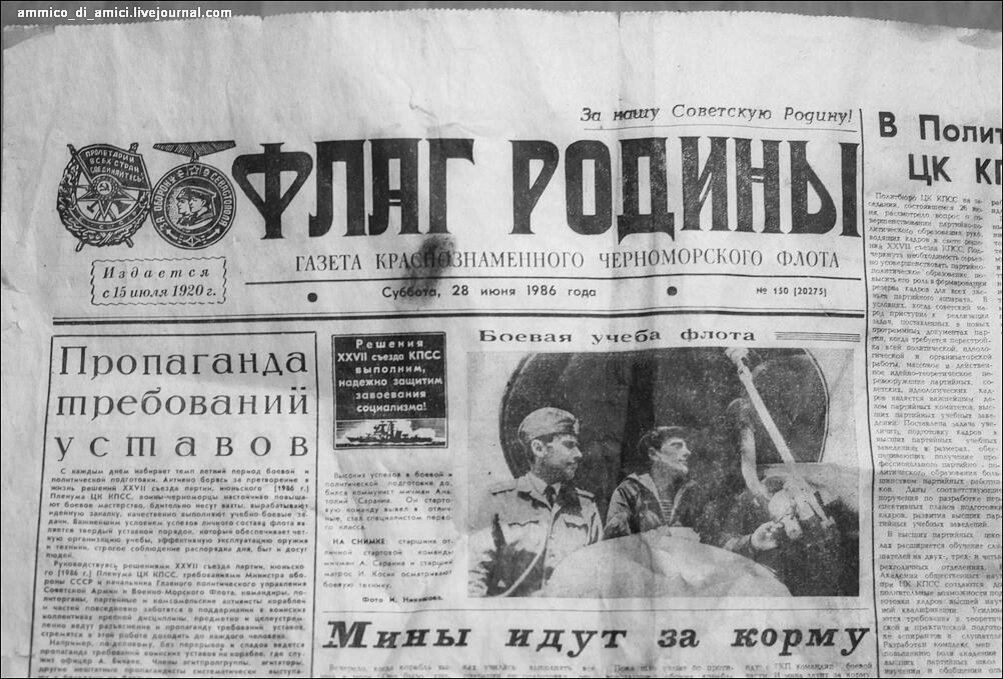 Тщательно выискивались заголовки статей типа "Все бомбы в цель!", "Спасибо нашему коку!", "Торпеды не пройдут мимо", "Каждый снаряд без промаха!", "Здесь рождаются мастера ракетных ударов" и т.п., потом вырезались или аккуратно вырывались из страниц и наклеивались на двери изнутри на уровне глаз сидящего на толчке. Это было увлекательное чтение. Так что заголовок с первого фото "Мины идут за корму" имел бы оглушительный успех.