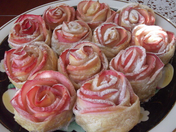Кто из Вас не готовил яблочную шарлотку? Вероятнее всего, что большинство ответит положительно. Красиво и вкусно! А сегодня я предлагаю Вам приготовить настоящий шедевр – яблочные розы из слоеного теста с корицей и фруктовым джемом. Рецепт очень прост, все элементарно и быстро. Ингредиенты (на 12 розочек): 500 гр. слоеного теста; 3-4 сладких спелых красных яблока; сок половины среднего лимона; немного муки, чтобы раскатать слоеное тесто; сахарная пудра для украшения 3 ст. л. фруктового или ягодного джема, или повидла, корица; Яблоки разрезать пополам, убрать серединку и нарезать полосками не более 2 мм. Чтобы яблоки не потемнели, опустить в воду с соком лимона (в 1,5-2 стакана теплой воды добавить лимонный сок или лимонную кислоту). Затем яблоки нужно прогреть, сделать «сгибаемыми», чтобы не ломались, опустить в кипящую воду на 1 минуту. Важно не передержать, иначе яблоки станут мягкими и будут расползаться при сгибании. Затем яблоки немного остудить, освободить от жидкости через
