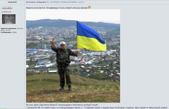 «Сегодня 4 августа 2015-го. Я занял одну из господствующих высот — Титовскую сопку — и поднял над Читой флаг Украины. Вату трясёт от бессильной злобы!» — подписано фото.