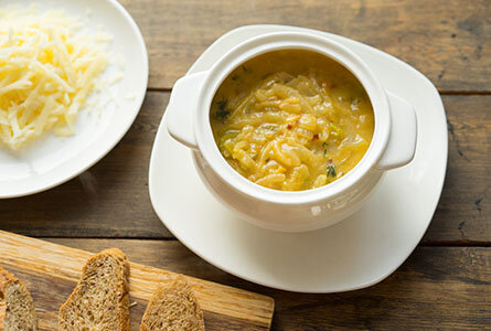 В состав этого блюда входит совсем не много ингредиентов. И поэтому он считается простым блюдом. Но французские повара его готовят в течение двух дней. В основном, время идет на приготовление бульона. Говяжьи кости с небольшим количеством мясо зажаривается в духовке на медленном огне 5-6 часов. Во время жарки, для предотвращения загорание, кости с мясом постоянно поливается водой. После этого в этих костях вариться бульон. Конечно это дело не простое, но отведать такой суп одно удовольствие. Вы конечно можете готовить его от обычного говяжьего бульона. И думаю вкус не пострадает от этого. Суп можно готовить к обеду или к большому семейному ужину. Я надеюсь что блюдо вам понравиться и доставит вам и вашей семье исключительное удовольствие. Ингредиенты (на 2-3 порции) 1. Берем лук разрезаем на четвертинки, а потом режем тонкой полоской. Постарайтесь брать не очень горький лук. 2. Берем сковородку добавляем сливочное масло и растапливаем его. После этого выкладываем лук. 3. Стеб