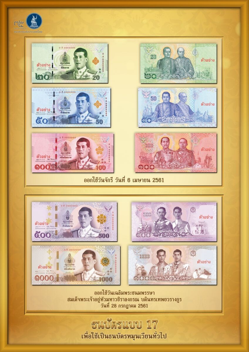 В Королевстве Таиланд впервые за многие десятилетия будут напечатаны деньги без портрета короля Пхумипона Адульядета (Рамы IX). «Вестник АТОР» знакомит со сроками их выпуска в оборот и внешним видом. На банкнотах 17-й серии, дизайн которых был в конце марта представлен центральным банком страны, будут размещены портреты Махи Вачиралонгкорна (Рамы Х), занявшего таиландский трон после смерти отца в октябре 2016 года. Официально Маха Вачиралонгкорн еще не коронован, однако в тайской традиции между фактическим началом правления нового монарха и его коронацией может пройти достаточно долгий срок, вплоть до нескольких лет. Так Пхумипон Адульядет начал править Таиландом в 1946 году, а процедура коронации прошла лишь в 1950. Как сообщается на сайте таиландского центробанка, первая серия банкнот с Рамой Х будет запущена в обращение в два этапа. С 6 апреля в оборот будут введены банкноты достоинством 20, 50 и 100 бат. Размер купюр и их цвет будет аналогичен размеру и цвету тех, которые находятс