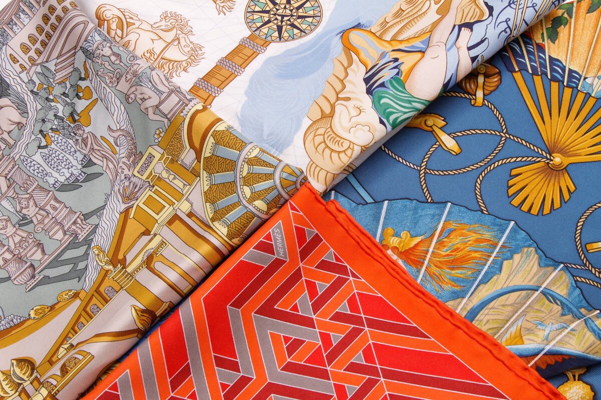 Для производства аутентичных платков Hermès используется 100%-ный шелк высокой плотности с фактурой в мелкий рубчик.