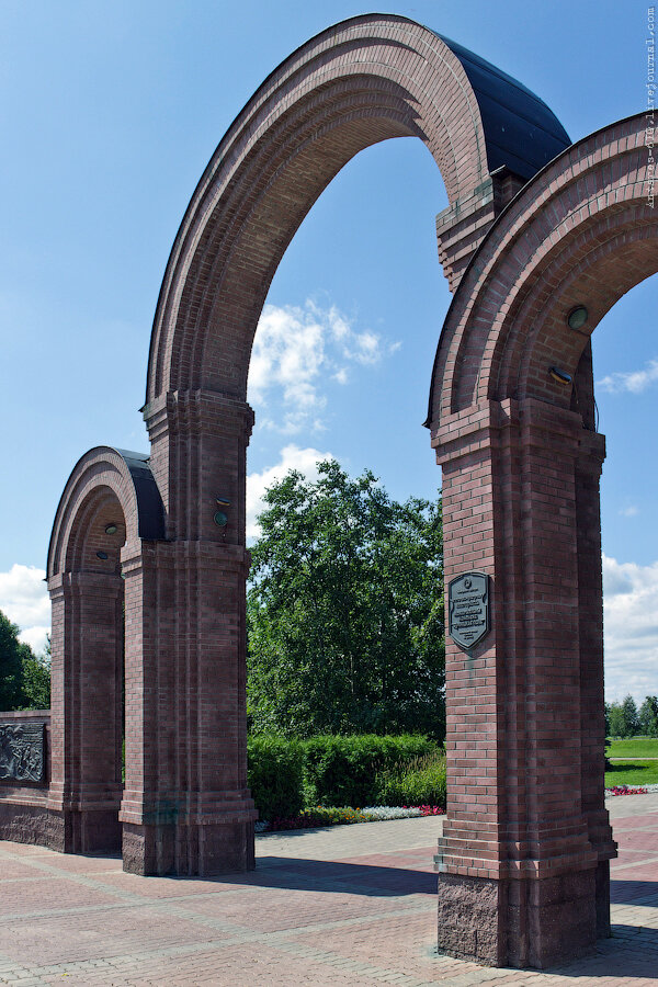 Справа и слева от ворот установлены шесть барельефов. Кликнув на каждый из них, можно получить более подробную информацию об обороне Могилёва в 1941 году.