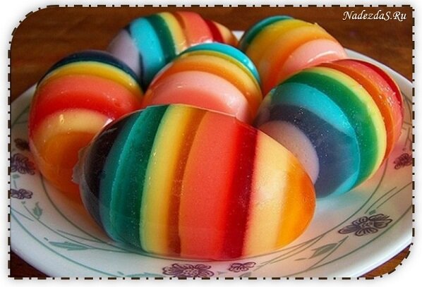 Что приготовить необычное и простое в изготовлении на пасхальный стол? Подойдет как на детский праздник так в качестве десерта на любое семейное торжество. Этот рецепт вкусных желейных яиц, который порадует детей и взрослых, смотрите ниже. Желейные писанки станут большим сюрпризом для детей. Цветные, словно радуга, они готовятся из небольшого количества ингредиентов и от вас не потребуется больших кулинарных способностей, поэтому смело можно заняться их приготовлением даже вместе с детками. Можно использовать сок вместо обычной воды, так будет еще полезнее. Ингредиенты: Приготовьте желе как написано на упаковке. Обычно один пакетик заливают 400 миллилитрами теплой воды, перемешайте и оставьте, чтобы желатин растворился.Если не найдете разноцветного желе, то используйте обычное, но замачивайте в разноцветном сиропе или сладком соке. Достаточно даже трех цветов. Куриные яйца помойте, сделайте небольшие дырочки на тупом конце яйца и вылейте белок с желтком. Скорлупу внутри сп