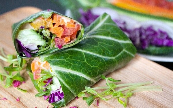 - Теперь ролл: заверните по одному разу верх и низ листа (положите их поверх овощей), затем подверните боковые стороны и продолжайте туго крутить ролл от низа к верху. Разрежьте ролл помолам острым ножом.