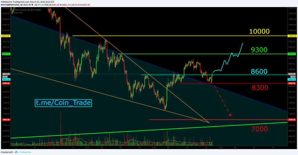 Стоп-лосс получается довольно короткий - 8250. В случае пробития уровня 8300 вероятность роста резко снизится, и цена может опуститься в район 7200. При пробитии 8300будем рассматривать вариант входа в шорт.