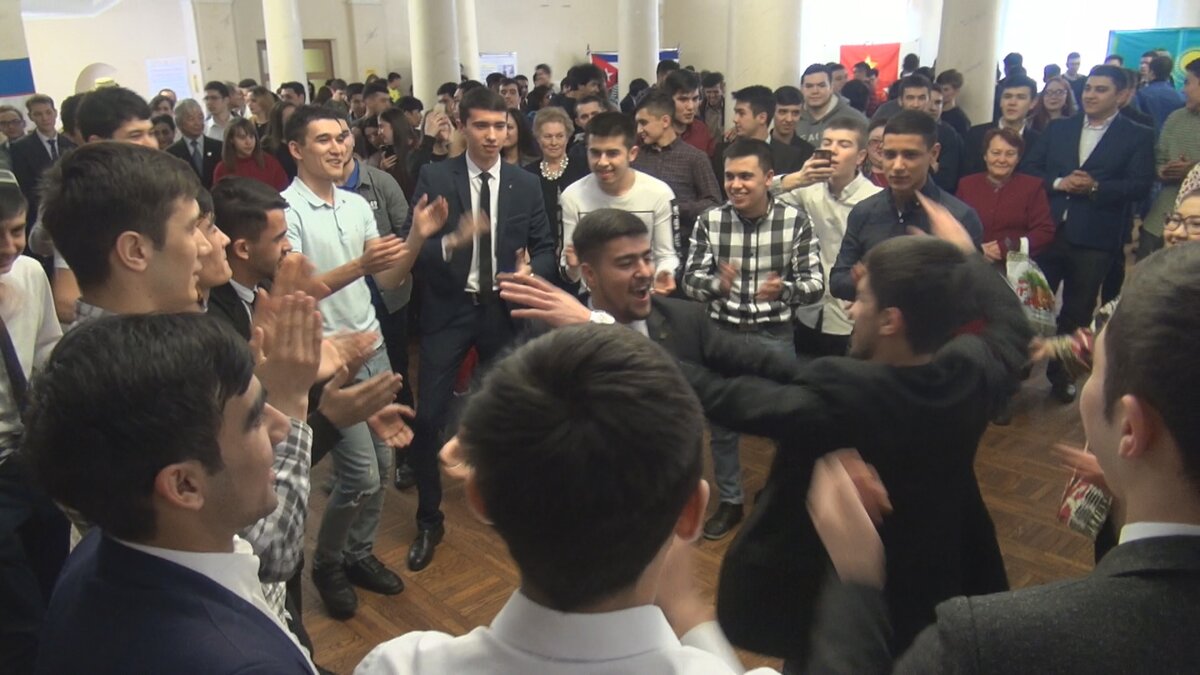 -Так как все было весело и все хотели танцевать. такая веселая атмосфера и я хотел сделать сюрприз. К танцу дружбы присоединились студенты из Латинской Америки, Африки и Азии. Порой их даже различить сложно - ребята обмениваются национальными украшениями и даже интересуются их значением. В такой одежде нынче не походишь. И, пожалуй, зима, это единственное, к чему трудно привыкнуть иностранным студентам. Студенты из Ирака, Сирии, Йемена и Египта представляют страны Ближнего Востока. На столе несколько видов плова. У каждого своя особенность. Например, арабы добавляют в него молоко. Вообще, плов - самое популярное блюдо на Наврузе.