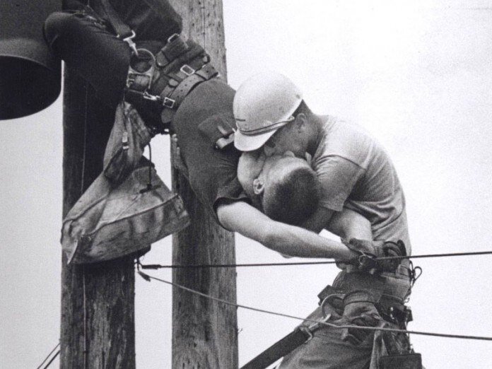 Эта фотография была сделана Рокко Морабито в 1967 году. В истории она осталась под названием «Поцелуй жизни», а фотограф получил за нее Пулитцеровскую премию. А вот история того, как был сделан снимок. В тот день два электрика Рэндалл Чампион и Джей Томпсон занимались плановой работой по замене проводов. Так получилось, что Рэндалл нечаянно коснулся одного из них и словил разряд в 4 000 вольт, что, конечно же, очень не кисло. Сердце Рэндалла от такого удара остановилось, а бездыханное тело повисло на столбе. Но с Рэндаллом был его напарник Джей и он не растерялся. Понимая, что времени у него нет, он начал оказывать первую помощь прямо на столбе, начав делать искусственное дыхание. Первая помощь была оказана удачно и, когда у Рэндалла начал прощупываться пульс, Джей закинул его на плечо, отцепил коллегу от страховочного снаряжения и спустился на землю. А когда приехали спасатели, ударенный током уже пришел в сознание. Через некоторое время он восстановился полностью и опять начал з