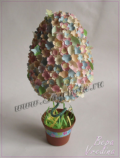 Основа деревца яйцо из папье-маше, ствол - толстая проволока, обкрученная мулине.