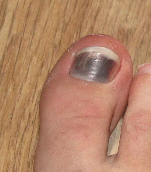 Если вы заметили черное пятно под ногтевой пластиной, вероятнее всего, это гематома. Незначительный удар или недолгая компрессия вполне могут привести к разрыву сосудов под ногтевой пластиной. Кровь, выделившаяся из сосудов, запекается и меняет цвет на темно-бордовый или даже почти черный. Иногда пятно может приобрести желтоватый оттенок. При надавливании на ударенный ноготь могут быть болевые ощущения, однако, они могут и отсутствовать. С течением времени синяк практически перестает приносить боль во время надавливания, разрастаться и приобретает четко очерченную форму. Если речь идет о пятне на ногте ноги, а вы точно уверены, что не ударялись, обратите внимание на вашу обувь. Тесная обувь сдавливает пальцы, и кровеносные сосуды в них могут разорваться, если сдавливание было сильным и продолжительным. Если вы уверены, что причина появления черных пятен на ногтях ног кроется именно в обуви, стоит ее сменить. Важно, чтобы вашим ногам было комфортно в обуви. И в первом случае, и в