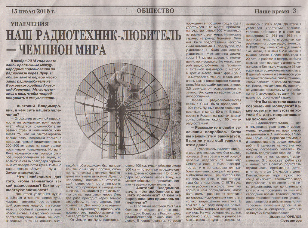 С волнами частотой 2-3 см в Орловской области работаю только я один. Всего же в России таких радиолюбителей около пяти человек. В соревнованиях, которые проходили в прошлом году и где я удостоился 1-го места, принимали участие около 200 участников из разных стран мира. Некоторые страны, например Германия, Япония, были представлены несколькими антеннами. В под| руппе, где участвовал я, было два десятка участников. Моя антенна диаметром 3,7 метра довольно неожиданно принесла мне 1-е место, второй радиолюбитель из Германии с антенной диаметром 5 метров, а третье место занял француз с 10-метровой антенной. В этом деле очень важно операторское мастерство. Мы передаём сигнал, и через 2,5 секунды он возвращается на землю. Это один из вариантов радиосообщения. Первая радиолюбительская связь в СССР была проведена в 1924 году. Лунные связи стали проводиться в конце 80-х гг В наше время в России на разных диапазонах работает около 100 лунных радиостанций.