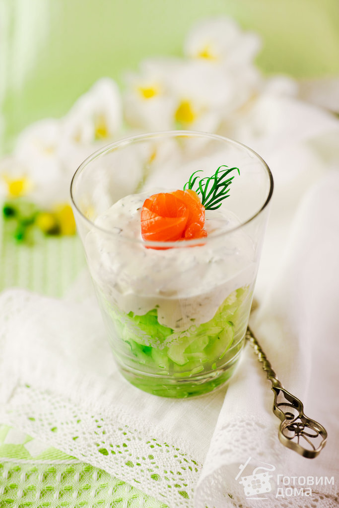ИНГРЕДИЕНТЫ огурцы свежие 3 шт., сельдерей черешковый 1 черешок, красная рыба 100-150 г., сметана 300 г., чеснок 1-2 зубчика (по вкусу), укроп пару веточек, сок лимона 1-2 ст.л. (по вкусу), соль, свежемолотый перец. Приготовление Подготовить продукты и высокие стаканы (салат подается порционно, в стаканах). По желанию, салат можно подать в салатнике. Чеснок очистить и мелко порубить.