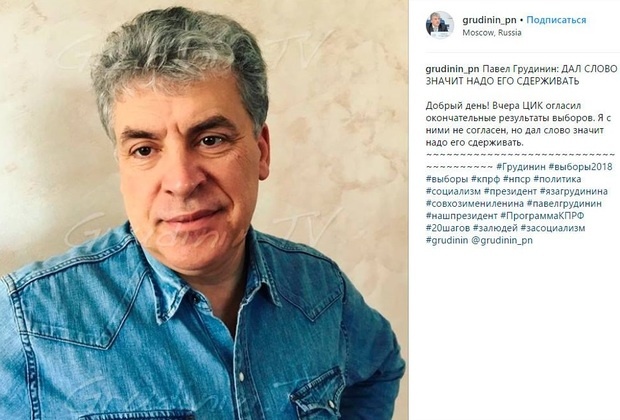 Павел Грудинин - кандидат в президенты от КПФР поспорил с журналистом Юрием Дуде . Суть споров заключалась в том, что если кандидат не наберёт 15 % голосов на выборах , он сбреет усы. Грудинин сбрил усы, признав поражение в споре с видеоблогером Ю. Дудем. В соответствии с данными ЦИК , Грудинин набрал на выборах 11, 77 % голосов, став вторым. Популярность его не так высока , многие его не знают. Возможно было бы больше голосов. Молодец дал слово и сдержал его. Хотелось, что б в будущем не спорил на что-то подобное, а продолжал идти к своей цели .