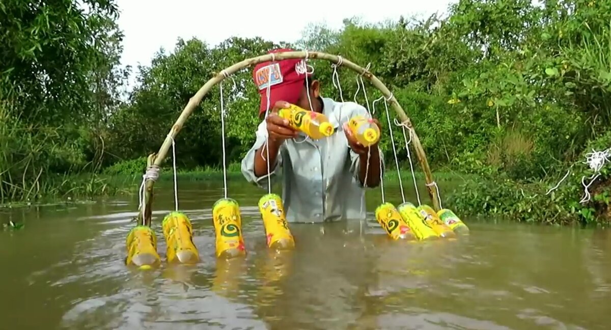 Каждый день на земле, миллионы людей ловят рыбу, кто то удочками , сетями или спиннингом и т.д., каких только способов не придумали, какие-то работают какие-то нет. Молодые рыбаки во Вьетнаме,недавно отличились придумав хитрый способ для ловли рыбы в не больших водоемах. Их приспособление достаточно простое, и не требует больших материальных затрат. Что нужно: 10 бутылок 0.5 с пробками. Прочный плетеный шнур метров 20 примерно. Леска для поводка. Крючки , размер зависит от желаемой добычи. Наживка, в данном случае земляной червь, но можно что угодно. В первую очередь необходимо разделить плетеный шнур на равных 10 частей, которые фиксируются к бутылке . Затем надо сделать 10 поводков, к которым вяжутся рыболовные крючки. Поводки с крючками вяжутся к бутылочной пробке, в которой делается два отверстия. В водоеме приходится делать прочное основание из подручных палок и дров, к которому вяжется готовая бутылочная снасть, и вяжется таким образом что бутылка находится на половину в вод