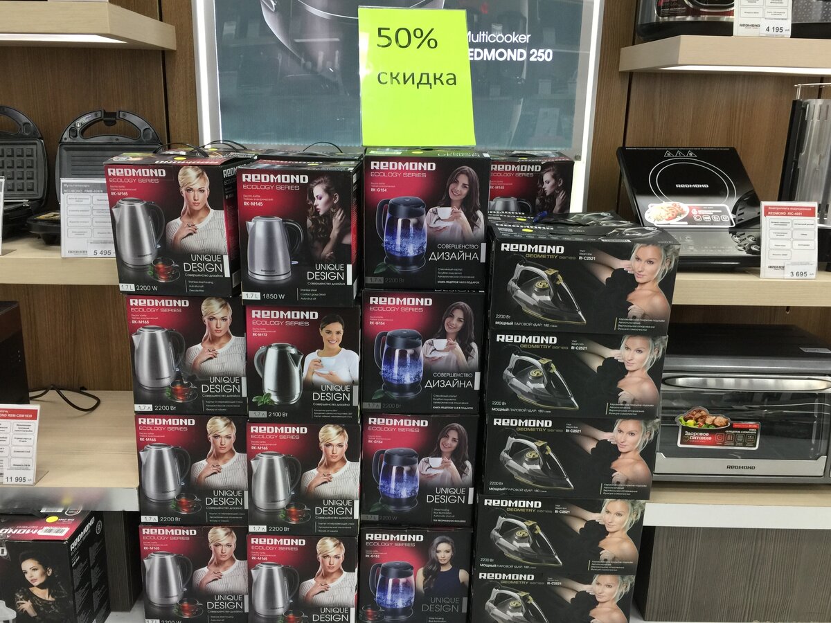В магазинах Redmond стоят горы картонных коробок с их продукцией, поверх которых установлена табличка 50%. Думаете это скидка из-за очередной распродажи! Нет. Похоже у них стало настолько много брака, что приходится его чинить и продавать. Хорошо, что хоть скидку дают. Так я думал ровно 30 секунд, пока случайно зашедшие покупатели не задали разумный вопрос. С какой цены скидывают половину? Может, как сейчас модно, сначала подняли цену в два раза. А потом с нее не жалко эти 50% скидывать. Хорошо, хоть предупреждают, что товар из ремонта. Но и чиненым товарам, которые продает Apple не все доверяют. А тут Redmond. Но есть польза и от этой акции! Вы можете поразглядывать картинки и увидеть какие конкретно модели из техники часто попадают в ремонт. И при выборе мультиварки или чайника сможете тщательнее планировать свою будущую покупку. Кстати. По поводу гарантии от Redmond. Нам пока в ней отказывают на основании того, что мы не имеем гарантийный талон. Но чек то у нас есть и пришл