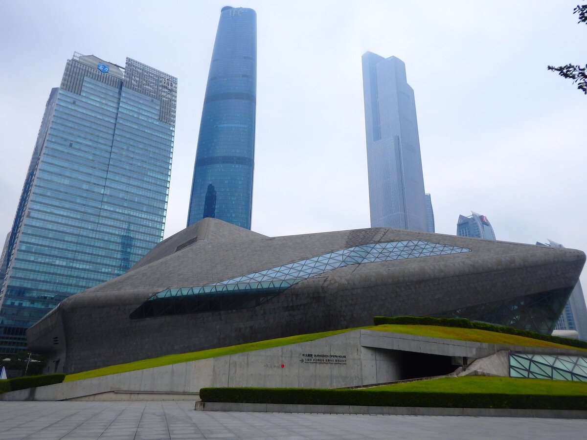 О планах по строительству оперного театра правительство Гуанчжоу заявило в 2002 году, тогда же был объявлен конкурс на лучший проект. Победила именитый британский архитектор Заха Хадид, на счету которой немало архитектурных сенсаций последних лет — в их числе Центр Гейдара Алиева в Баку и канатная дорога Нордкетте в Инсбруке. В основу плана здания положен принцип «двойной гальки» — его обтекаемые формы дей
